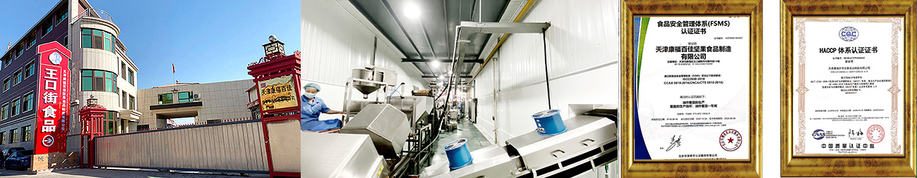 天津康福百佳坚果食品制造有限公司成立于2013年,位于天津市静海区王口镇,厂房占地面积8000平方米,主要生产油炸类、烘烤类(兰花豆)等休闲食品。